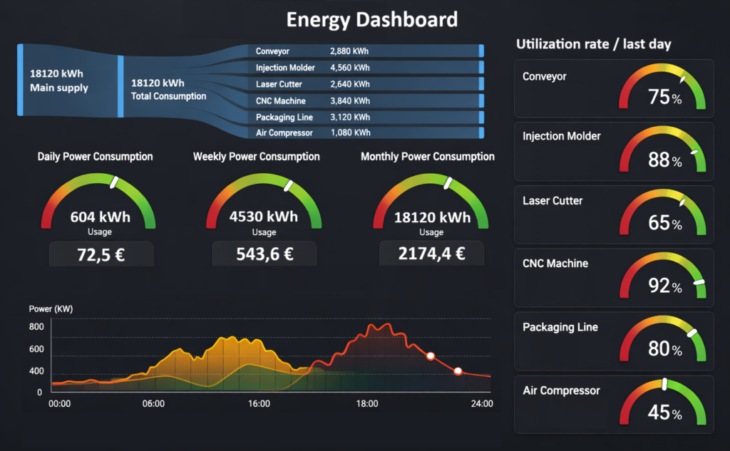 Saat reaaliaikaisen tiedon siitä, paljonko yksittäinen kone kuluttaa energiaa ja mikä sen käyttöaste on. Tyhjäkäynti ja kuormituspiikit näkyvät suoraan mittauksessa. Näin löydetään kohteet, joissa energiaa kuluu turhaan tai joissa kuormitus poikkeaa normaalista.