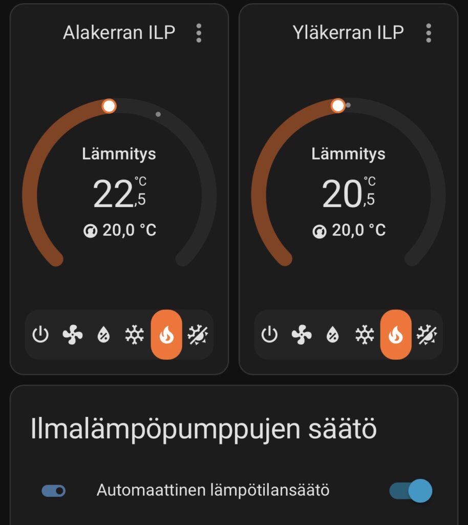 Home Assistant optimoi tämän asennuskohteen lämmitystä automaattisesti sähkön hinnan mukaan. Kun sähkö on halpaa, ilmalämpöpumppujen lämpötilaa nostetaan — ja kun hinta nousee, lämpötilaa lasketaan ilman että mukavuus kärsii.