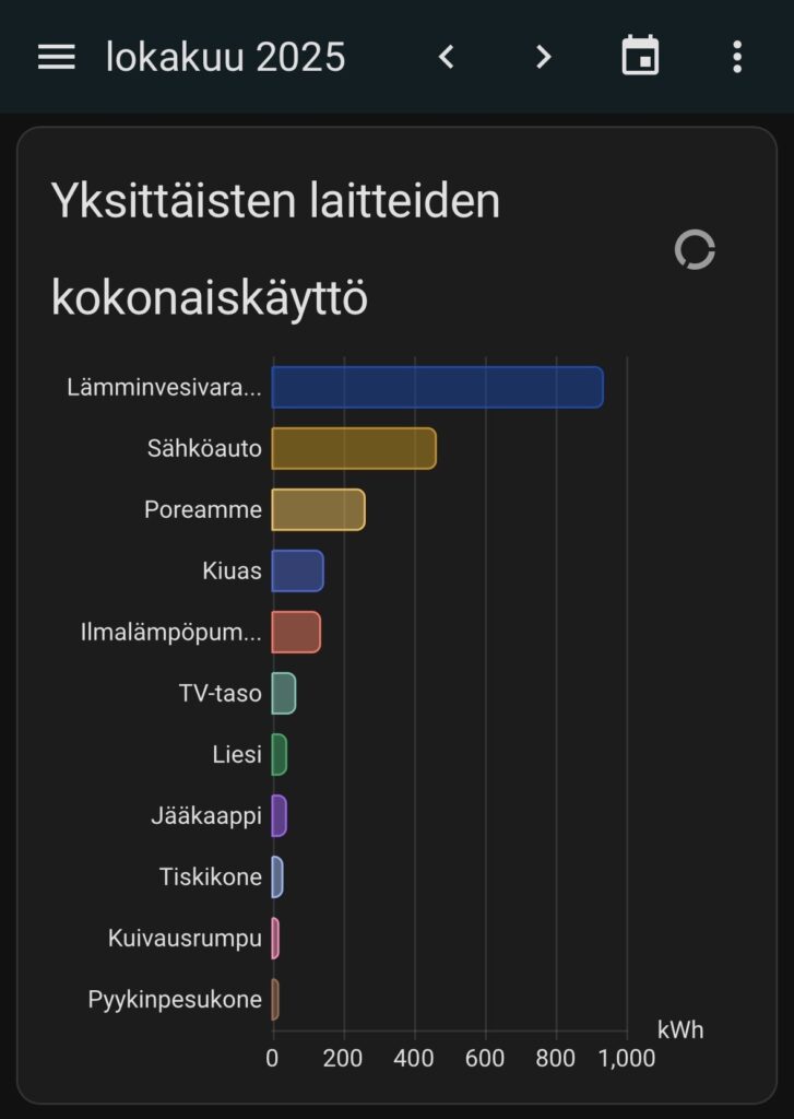 Sähkölaitteiden kulutus haluttiin näkyviin tarkasti ja laitekohtaisesti. Seurantaan otettiin kaikki kodin suurimmat kuluttajat: lämminvesivaraaja, sähkökiuas, poreamme, auton latausasema, liesi, kodinkoneet ja viihdelaitteet. Kolmivaihelaitteet mittaroitiin asentamalla kompaktit virtamittarit suoraan sähkökeskukseen, ja yksittäisten laitteiden kulutus tuotiin näkyviin Shellyn älypistorasioilla. Kaikki mittarit yhdistettiin Home Assistantiin, jossa käyttäjä näkee jokaisen laitteen kulutuksen selkeästi ja reaaliaikaisesti. Home Assistantin energianseurantasivu näyttää kulutuksen eri aikajaksoilla — kuvassa esimerkkinä yhden kuukauden yhteenveto.