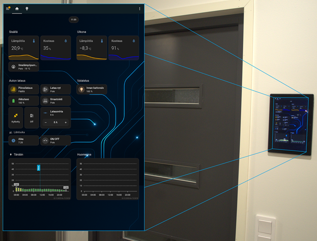 Toteutettu Home Assistant Green älykotiohjauksella ja erillisellä 11″ näytöllä. Visuaalinen esitys sisä- ja ulkolämpötiloista, sekä sen hetkisestä pörssisähköhinnasta. Lisäksi Mitsubishin ilmalämpöpumpun ohjaus, auton latausaseman ohjaus, sekä useampia valo- ja lämpötilaohjauksia.